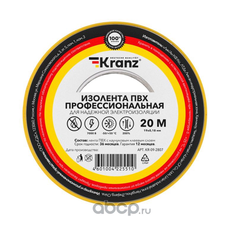 Изолента ПВХ KRANZ профессиональная, 0.18х19 мм, 20 м, желто-зеленая (10 шт./уп.)