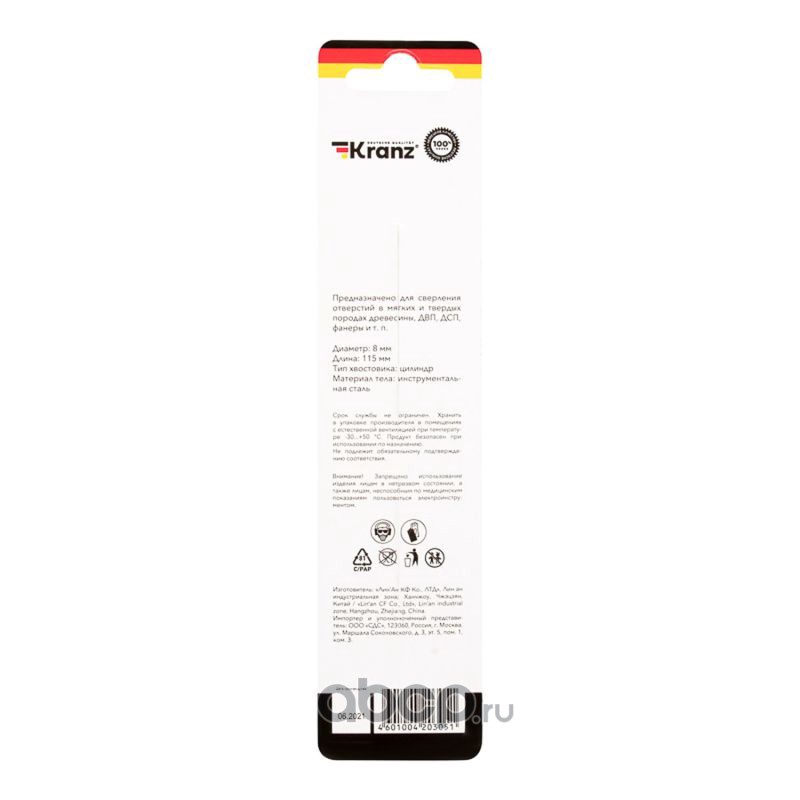Сверло по дереву 8х115 мм, цилиндрический хвостовик Kranz