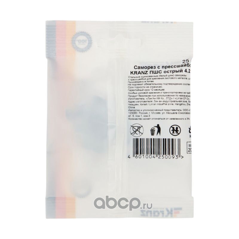 Саморез с прессшайбой KRANZ ПШС острый 4.2х16, пакет (25шт.)