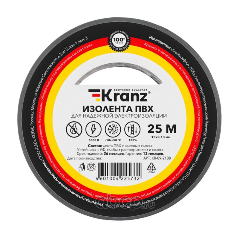 Изолента ПВХ KRANZ 0.13х15 мм, 25 м, серая (5 шт./уп.)