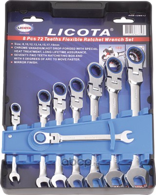 | Licota | ARW12MK12 | Набор ключей трещоточных комбинированных гибких 72 зуба 8-19мм, 8 предметов на пластиковом держател | ||