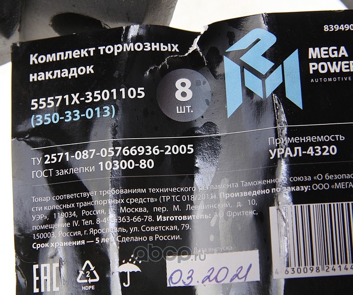 Накладка тормозной колодки УРАЛ-55571Х сверленая расточенная комплект 8шт. с заклепками