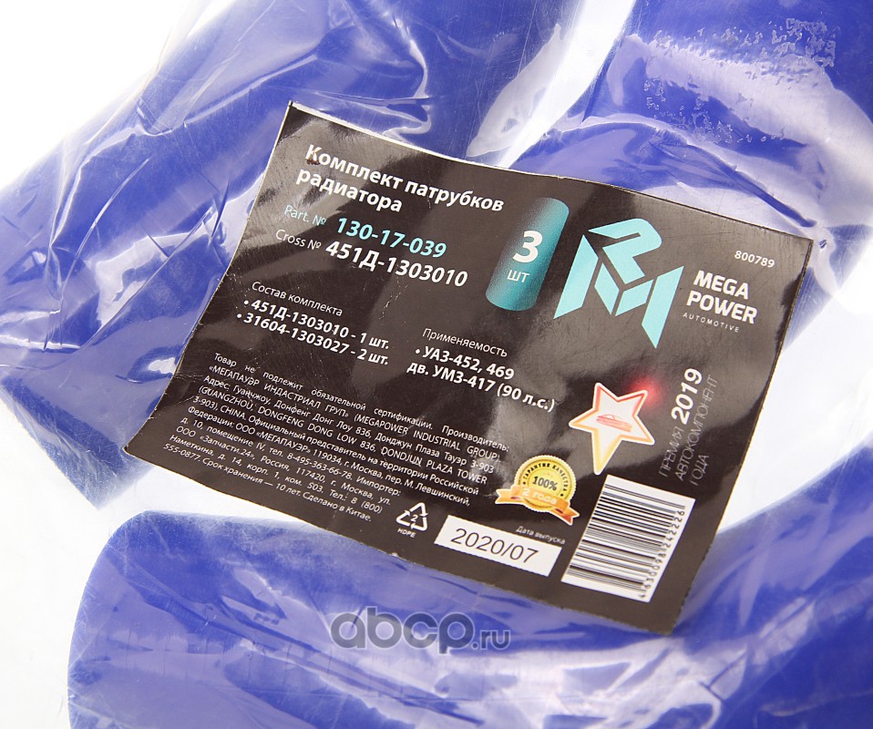 | MEGAPOWER Automotive | 13017039 | Патрубок УАЗ-452,469 дв.УМЗ-417 (90 л.с) радиатора комплект 3шт. синий силикон | ||