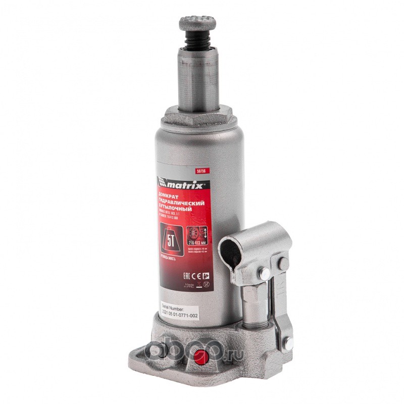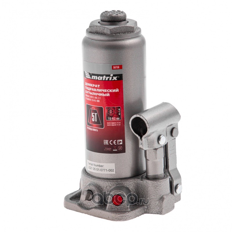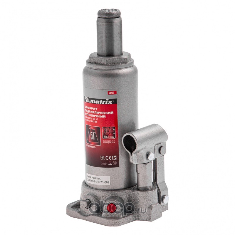 Домкрат гидравлический бутылочный, 5 т, высота подъема 216-413 мм, в пластиковый кейсе Matrix