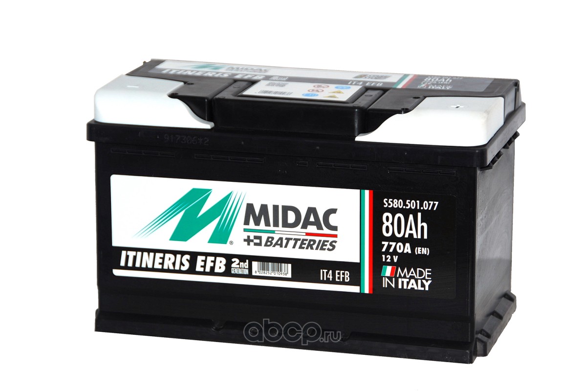 | Midac | 580501077 | Батарея аккумуляторная 80А/ч 770А обратная полярн. стандартные (Европа) клеммы | ||