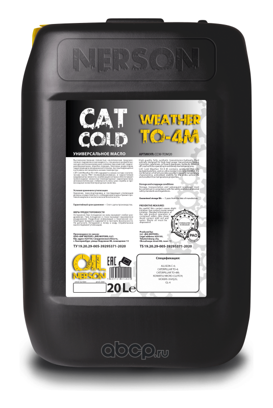 Высококачественная полностью синтетическая трансмиссионно-гидравлическая жидкость CAT Cold Weather TO-4M (SAE 0W-20) 20л