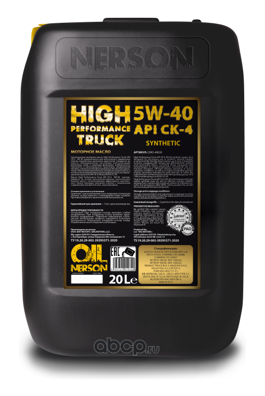 Всесезонное синтетическое моторное масло High Performance Truck CK-4 5W-40 20л