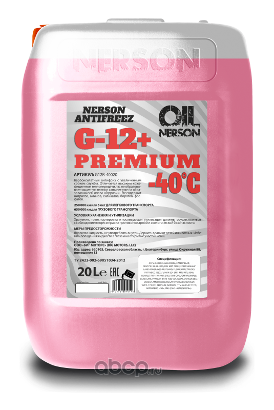 | NERSON OIL | G12RC0020 | Охлаждающая жидкость ANTIFREEZ C HD Premium G-12+ 20л КРАСНЫЙ концентрат | ||