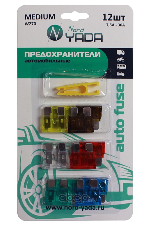 NORD YADA 902258 Предохранитель MEDIUM (стандарт) набор 12шт. с пинцетом (7.5,10,15,20,25,30А по 2шт.)