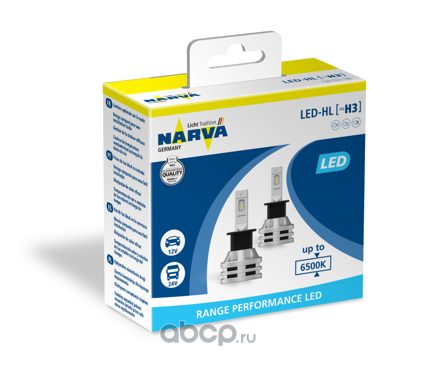 | Narva | 180583000 | Лампа светодиодная 12/24V H3 19W PK22s 6500K Range Performance LED 2 шт. картон | ||