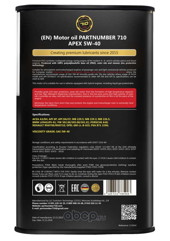 PARTNUMBER 710 171054 Масло моторное синтетика PARTNUMBER 710 APEX 5W-40 1 л.