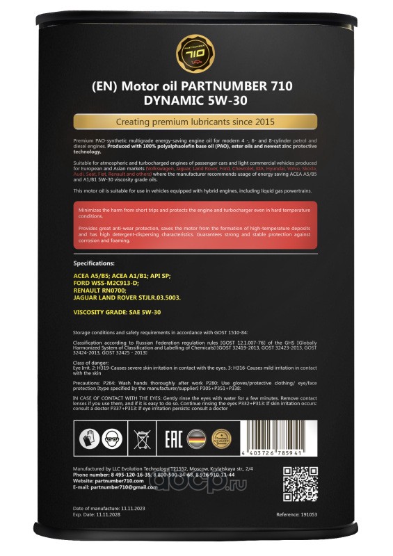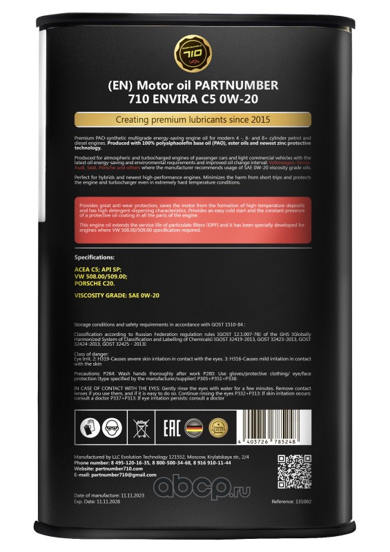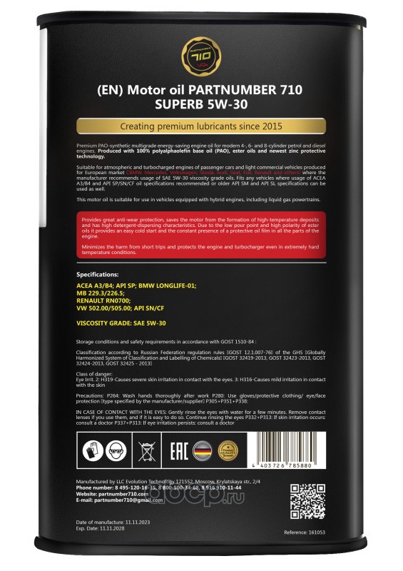 Ключевая цель создания продукта Partnumber 710 - появление на российском рынке моторных масел, абсолютно не имеющих аналогов ни по цене, ни по качеству. И эту задачу команде удалось решить с помощью лучших немецких технологов.