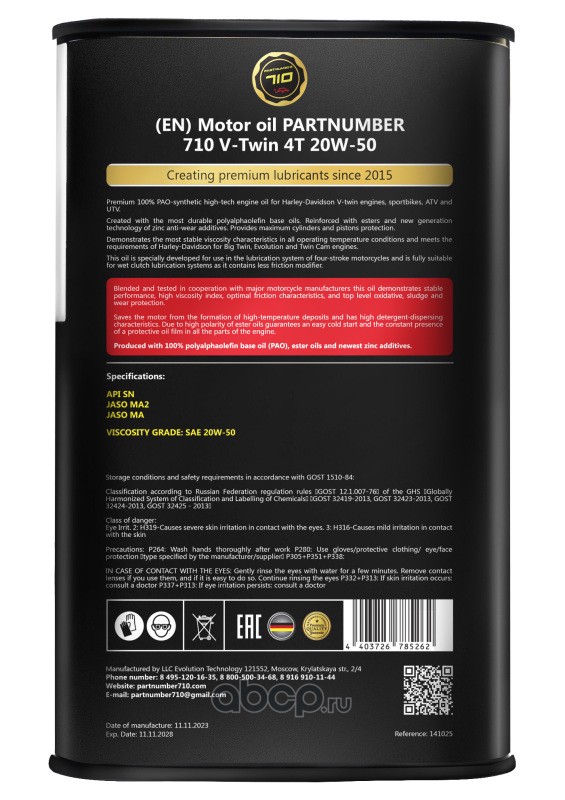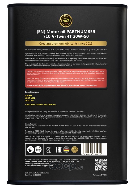 Продукт - масла линейки Partnumber 710 - создан на основе 100% полиальфаолефиновых и эстеровых синтетических базовых масел и самых современных присадочных пакетов от компаний Infineum и Afton Chemical.