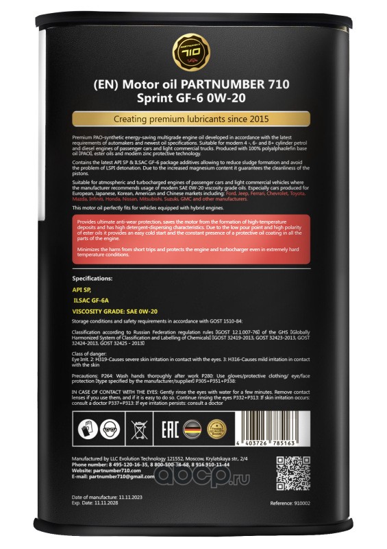 PARTNUMBER 710 910002 Масло моторное синтетика PARTNUMBER 710 Sprint GF-6 0W-20 1 л.