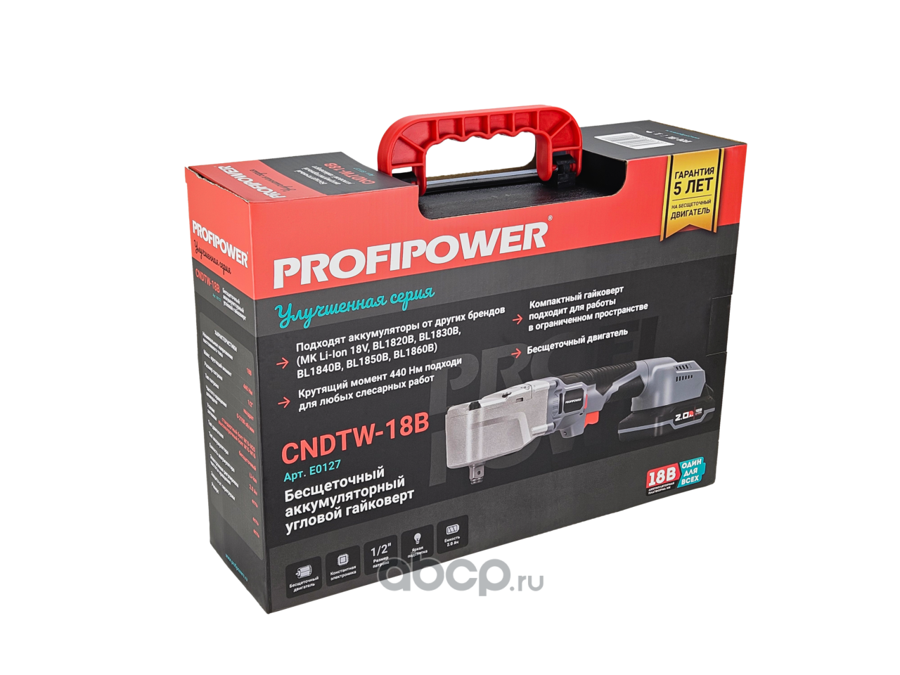 | PROFIPOWER | E0127 | Аккумуляторный бесщеточный угловой гайковерт CNDTW-18B (18В,Li-ion-2шт, 2.0Ач, 440Нм,адаптер для бит,З/У, в коробке) | ||