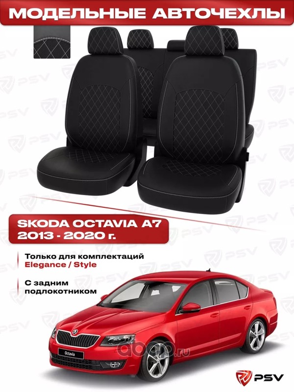 Чехлы в машину PSV для Skoda Octavia/Шкода Октавия А7 2013-2020 г. - (Elegance/Style) с задним подлокотником, РОМБ/отстрочка белая, черная экокожа "Оригинал