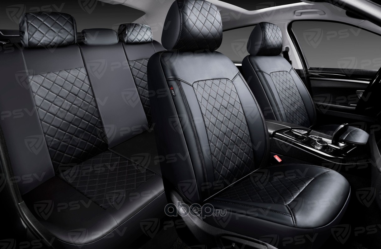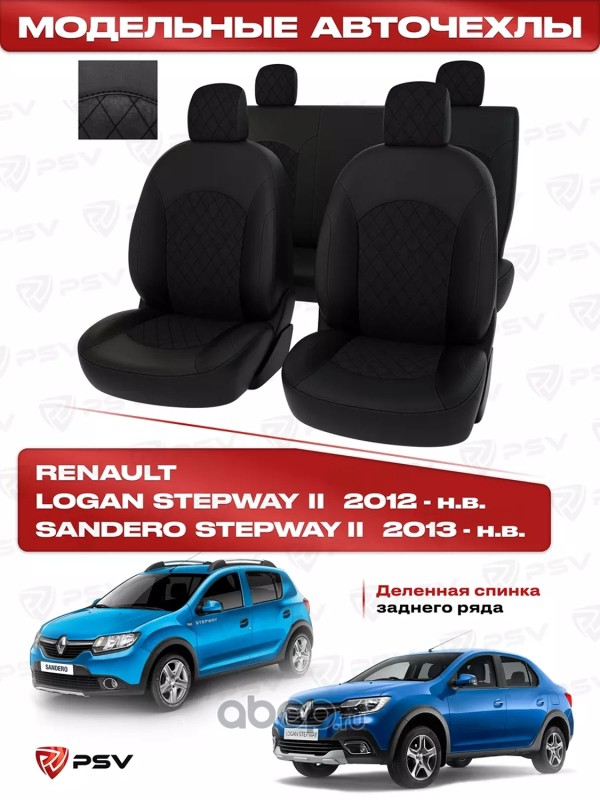 Чехлы в машину PSV для Renault Logan/Sandero/Stepway 2012-> деленная спинка, РОМБ /отстрочка черная, черная экокожа + черная алькантара Оригинал