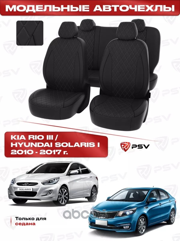 Чехлы Hyundai Solaris I/Kia Rio III 2010-2017 г. - Sd деленная спинка, РОМБ/отстрочка черная, черная экокожа ""Статус