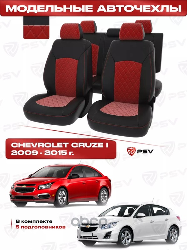 Чехлы в машину PSV для Chevrolet Cruze/Шевроле Круз I 2009-2015 г. - 5 подголовников, черный/отстрочка красная, экокожа "Оригинал