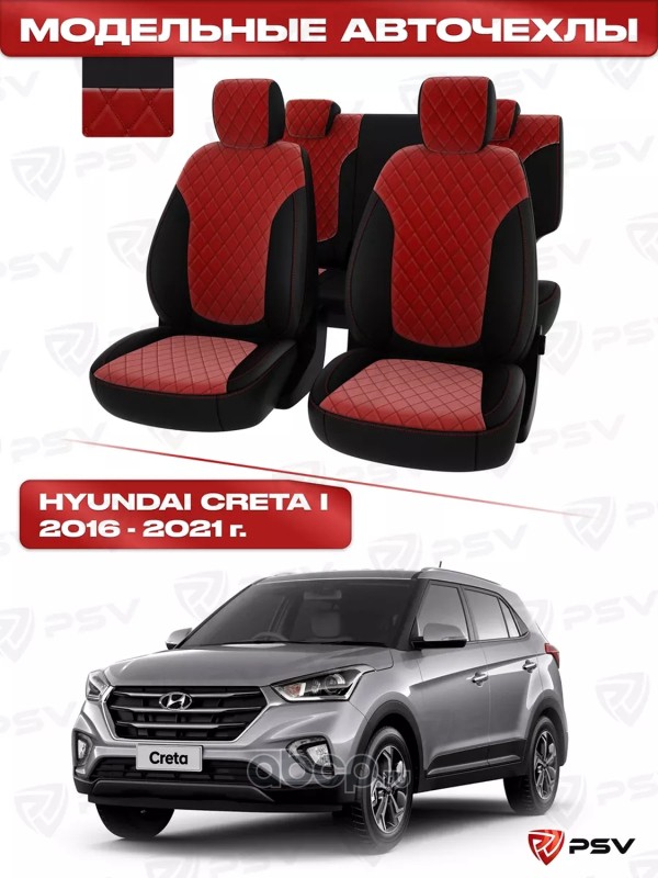 Чехлы в машину PSV для Hyundai Creta I 2016-2021 г. - РОМБ/ отстрочка красная, черная экокожа + красный велюр "Оригинал
