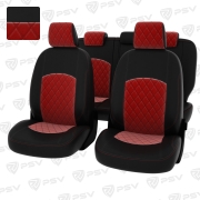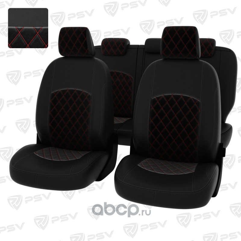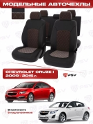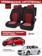 Чехлы в машину PSV для Chevrolet Cruze/Шевроле Круз I 2009-2015 г. - 5 подголовников, РОМБ/отстрочка красная, черная экокожа + черный велюр "Оригинал