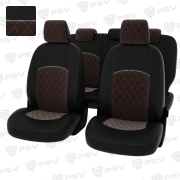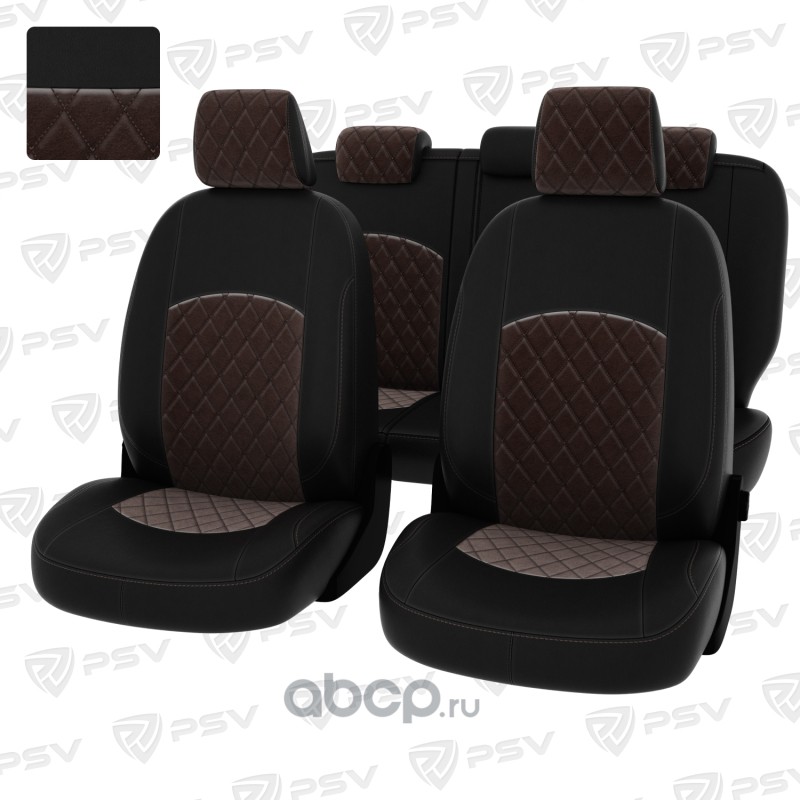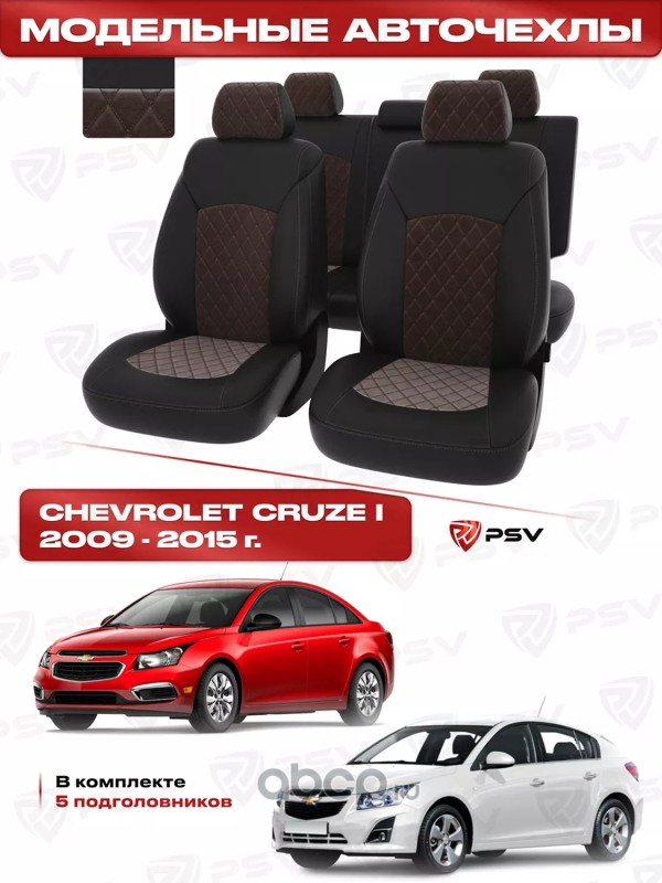 Чехлы в машину PSV для Chevrolet Cruze/Шевроле Круз I 2009-2015 г. - 5 подголовников, РОМБ/отстрочка коричневая, черная экокожа + коричневый велюр "Оригинал