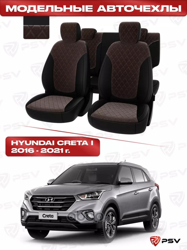 Чехлы в машину PSV для Hyundai Creta I 2016-2021 г. - РОМБ/ отстрочка коричневая, черная экокожа + коричневый велюр "Оригинал