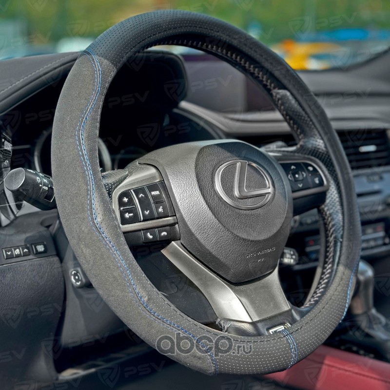 Чехол на руль оплетка ALCANTARA (Черный/Отстрочка синяя), размер M 37-39 см