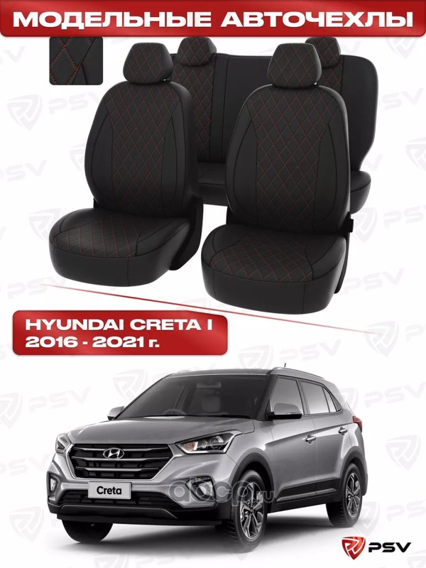 Чехлы в машину PSV для Hyundai Creta I 2016-2021 - РОМБ/отстрочка красная, черная экокожа "Статус