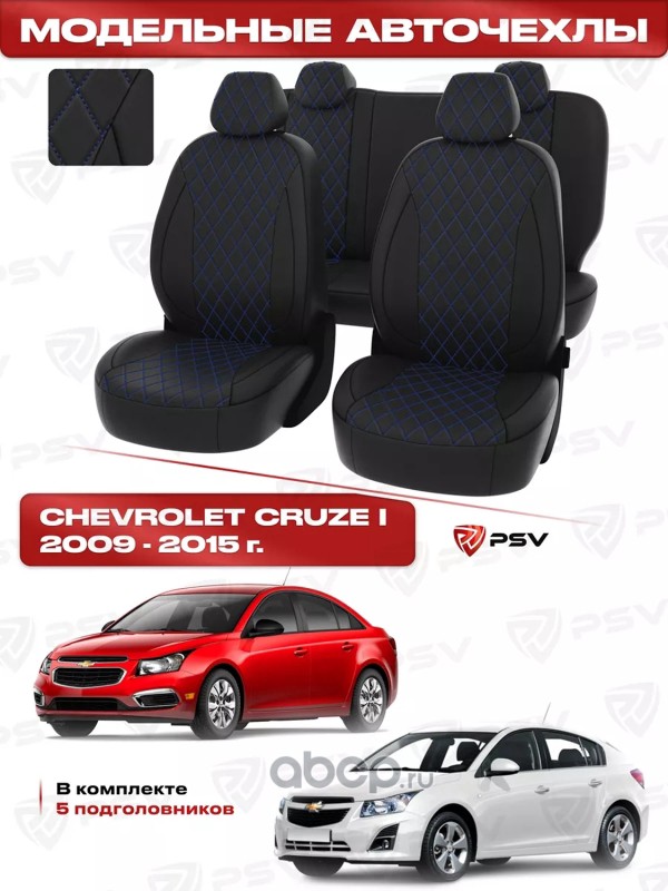 Чехлы Chevrolet Cruze I 2009-2015 г. - 5 подголовников, РОМБ/отстрочка синяя, черная экокожа ""Статус