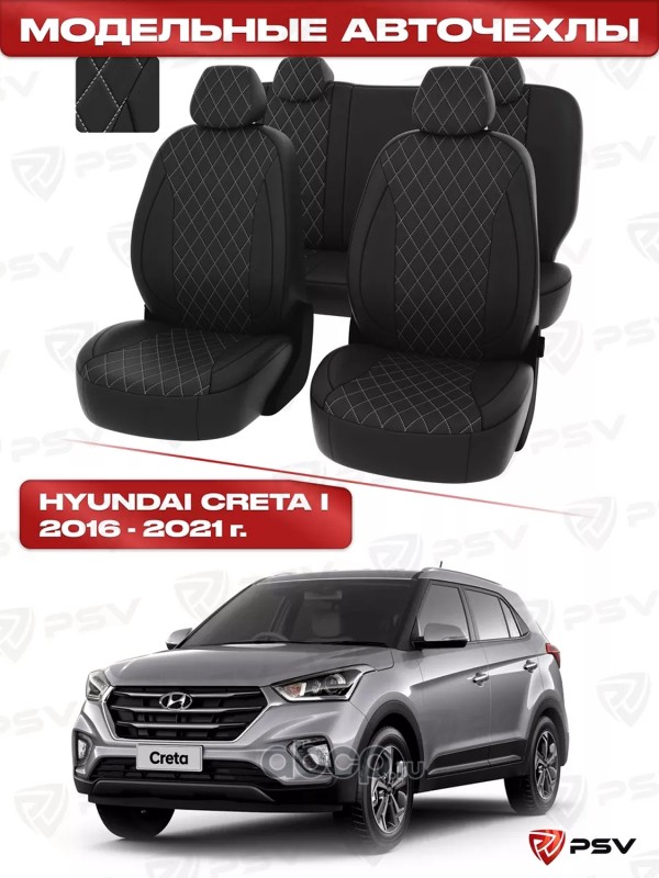 Чехлы в машину PSV для Hyundai Creta I 2016-2021 - РОМБ/отстрочка белая, черная экокожа "Статус