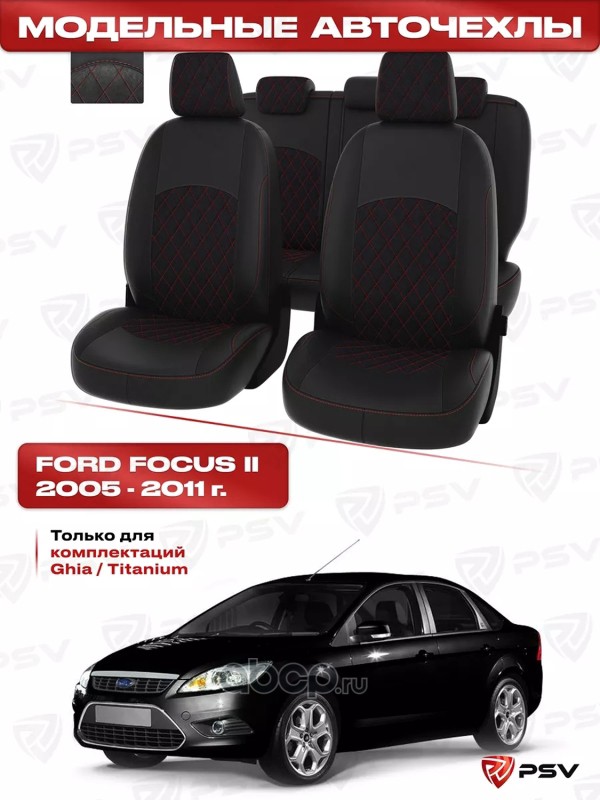 Чехлы в машину PSV для Ford Focus/Форд Фокус II 2005-2011 г. - (Ghia, Titanium) РОМБ/отстрочка красная,черная экокожа+ черная алькантара "Оригинал