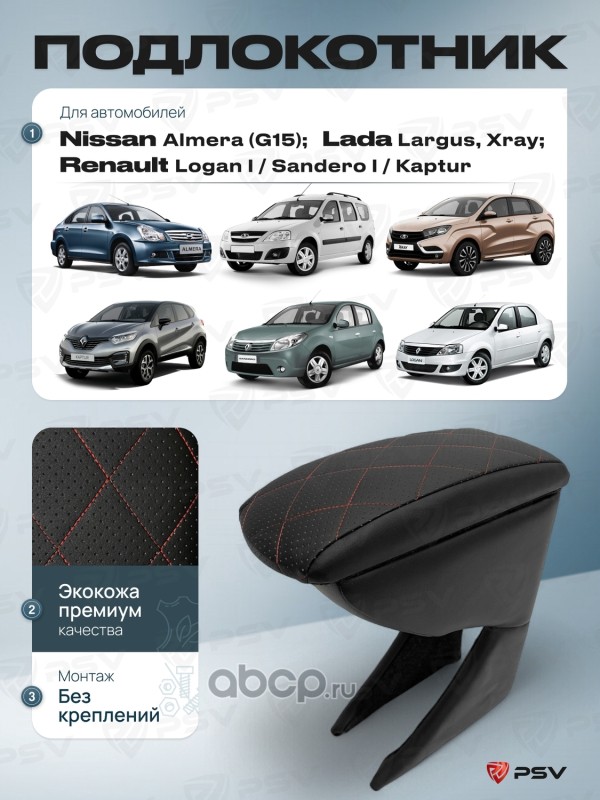 Подлокотник PSV для Nissan Almera (G15); Renault Logan I/Sandero I/Kaptur; Lada Largus, Xray - отстрочка красная