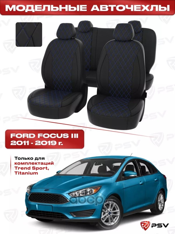 Чехлы в машину PSV для Ford Focus/Форд Фокус III 2011-2019 г. - (Trend Sport, Titanium) РОМБ/отстрочка синяя, черная экокожа "Статус