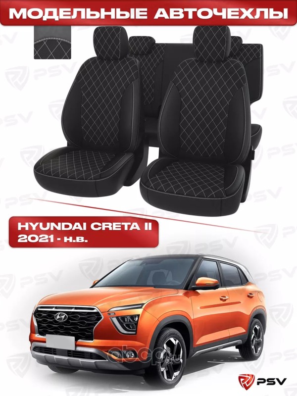 Чехлы в машину PSV для Hyundai Creta II 2021-> РОМБ/отстрочка белая, черная экокожа "Оригинал