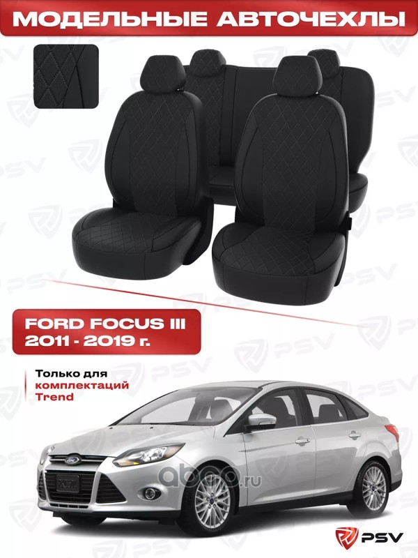 Чехлы в машину PSV для Ford Focus/Форд Фокус III 2011-2019 г. - (Trend Sport, Titanium) РОМБ/отстрочка красная, черная экокожа + черная алькантара "Оригинал