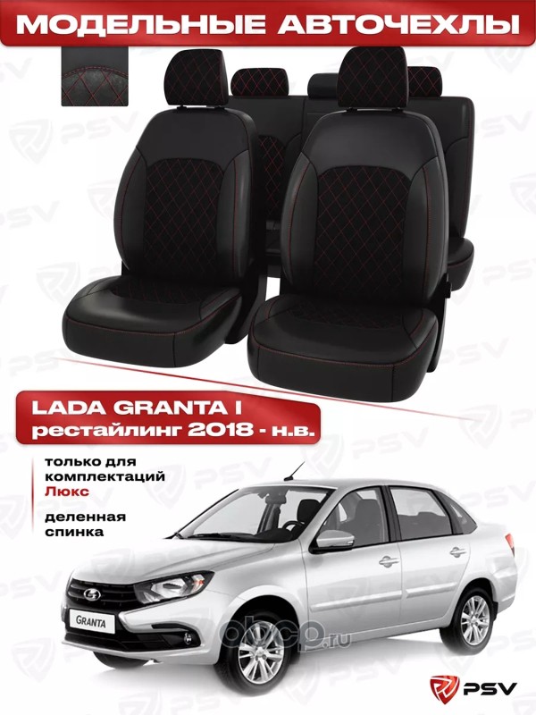Чехлы в машину PSV для Lada Granta/Лада Гранта I 2018-> Рестайлинг, (Люкс), 5 подголовников, деленная спинка, РОМБ/отстрочка красная, черная экокожа + черная алькантара Оригинал