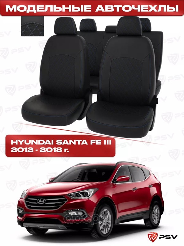 Чехлы в машину PSV для Hyundai Santa Fe III 2012-2018 г. - РОМБ/отстрочка синяя, черная экокожа "Оригинал