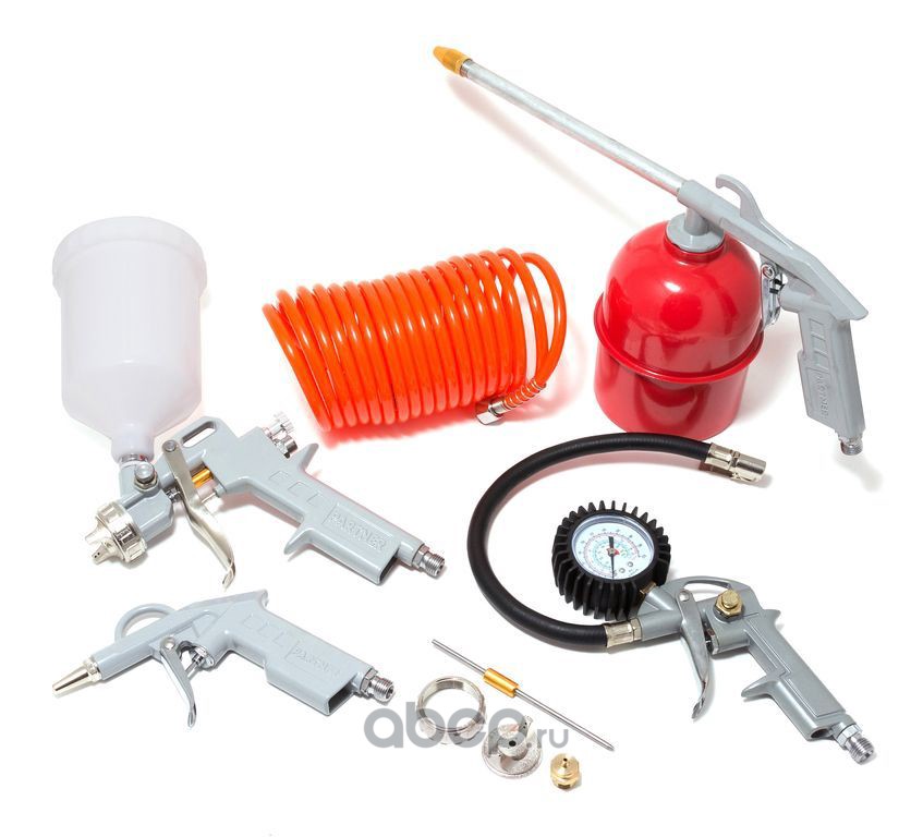 | Partner | 8031K5G | Набор пневмоинструментов 5 пр: краскораспылитель сопло 1.5 мм + 2.0 мм, шланг воздушный с фитингами, пистолет обдувочный, пистолет для подкачки, пистолет для мойки | ||