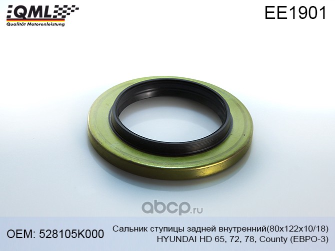 | QML | EE1901 | Сальник ступицы задней внутренний HYUNDAI HD65,72,78,County ЕВРО-3 80х122х10/18 528105K000 | ||
