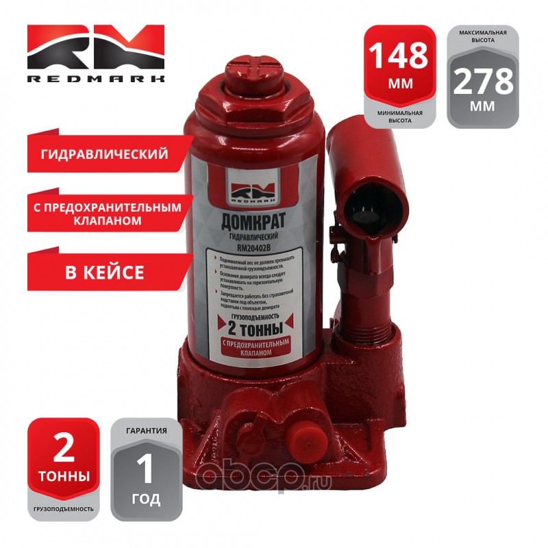 | REDMARK | RM20402B | Домкрат гидравлический 2т.с перепускным клапаном (высота мин/макс 148/278мм) (в кейсе) | ||