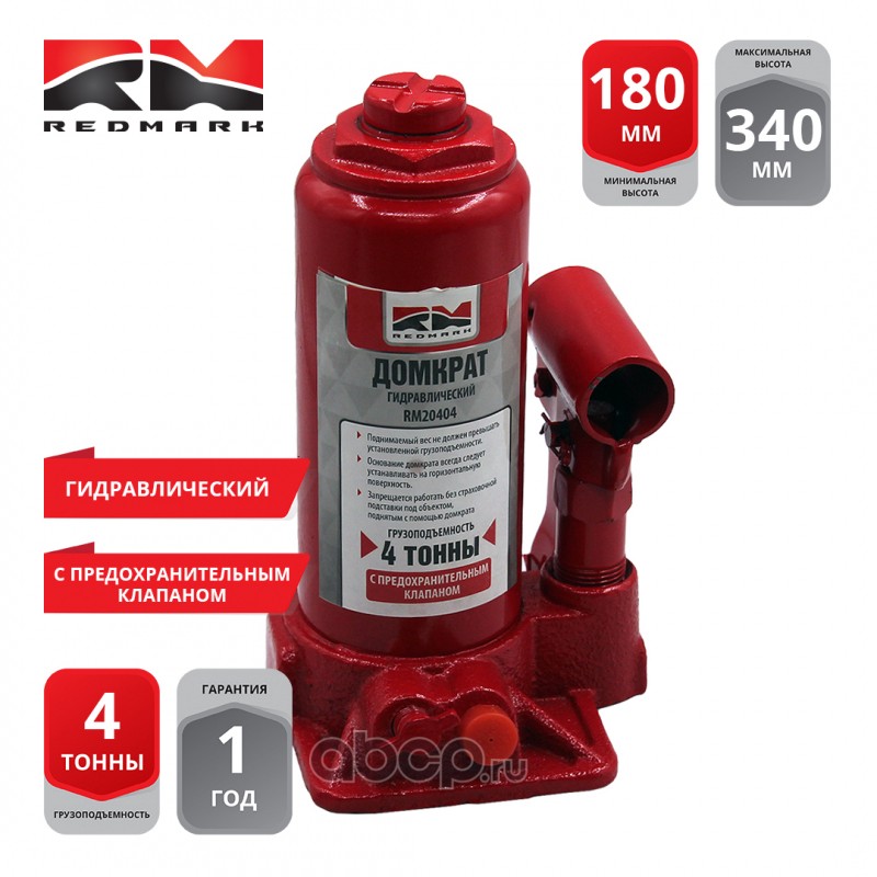 | REDMARK | RM20404 | Домкрат гидравлический 4т.с перепускным клапаном (высота мин/макс 180/340мм) | ||