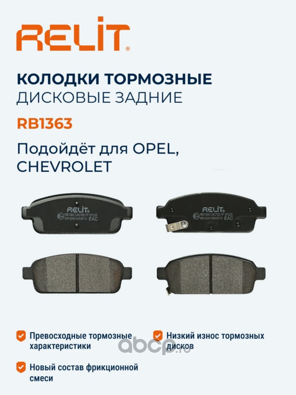 | RELIT | RB1363 | Колодки тормозные дисковые задние керамические RELIT RB1363 | ||