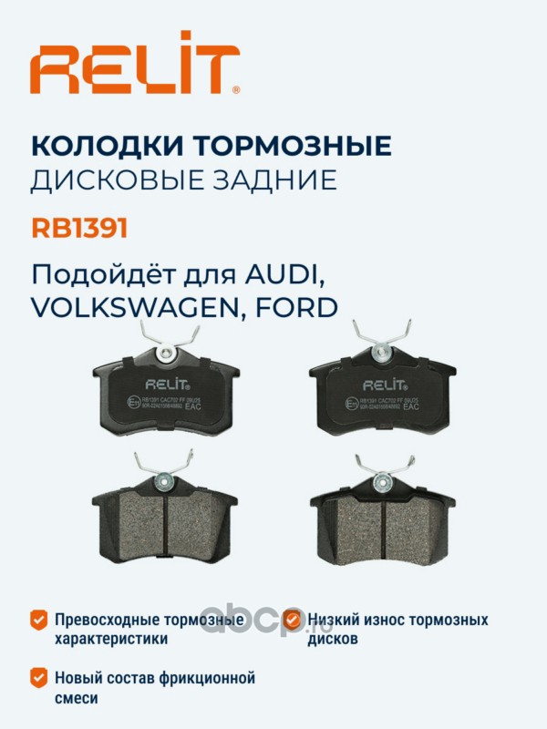 | RELIT | RB1391 | Колодки тормозные дисковые задние керамические RELIT RB1391 | ||