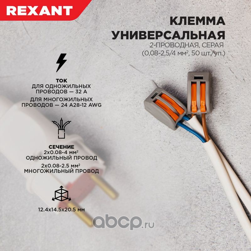 Универсальная клемма 2-проводная, серая (0,08-2,5/4 мм²) (50 шт./уп.) REXANT