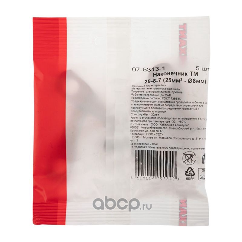 Наконечник медный ТМ 25-8-7 (25мм² - Ø8мм) (в упак. 5 шт.) REXANT