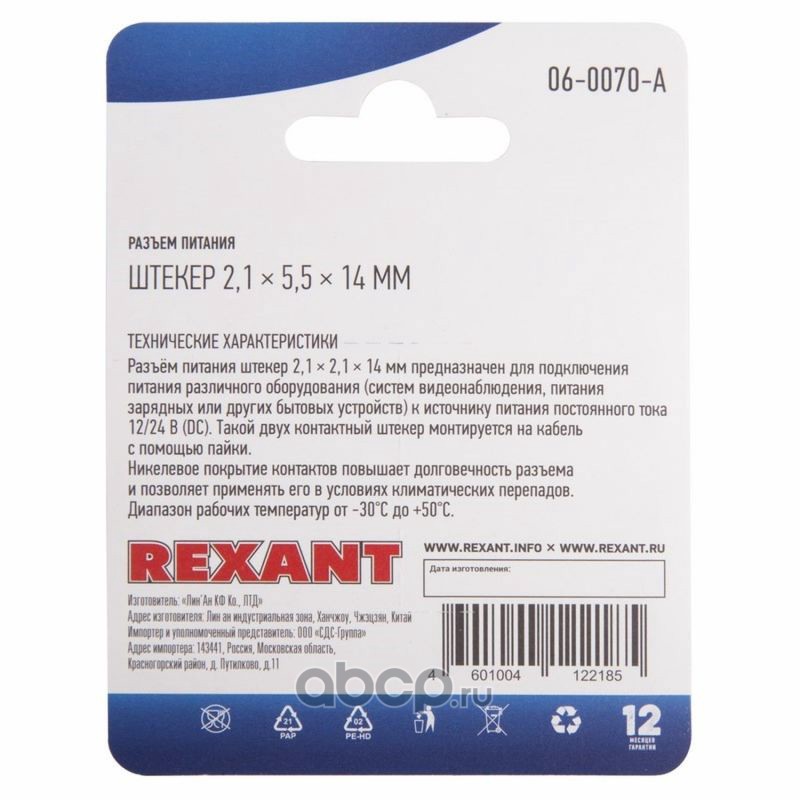 Разъем питание на кабель, штекер 2,1х5,5x14мм., (1шт.) REXANT