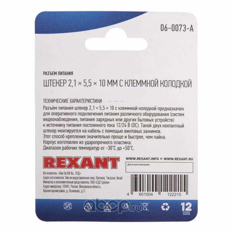 Разъем питание на кабель, штекер 2,1х5,5x10мм. с клеммной колодкой, (1шт.) REXANT