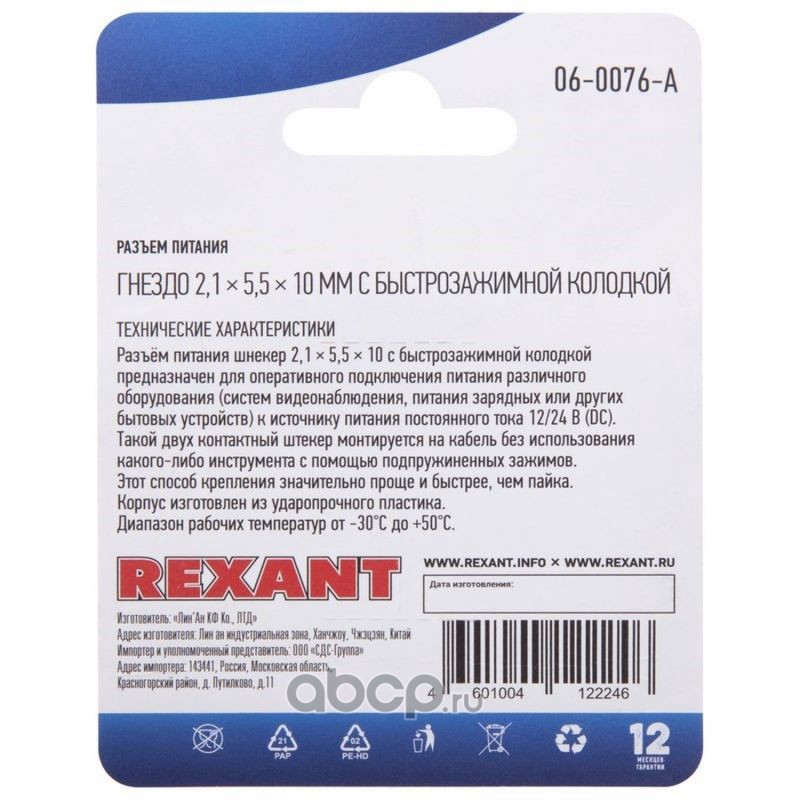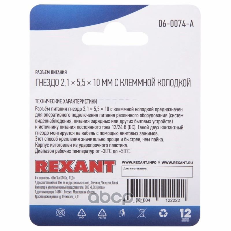 Разъем питание на кабель, гнездо 2,1х5,5x10мм. с быстрозажимной колодкой, (1шт.) REXANT