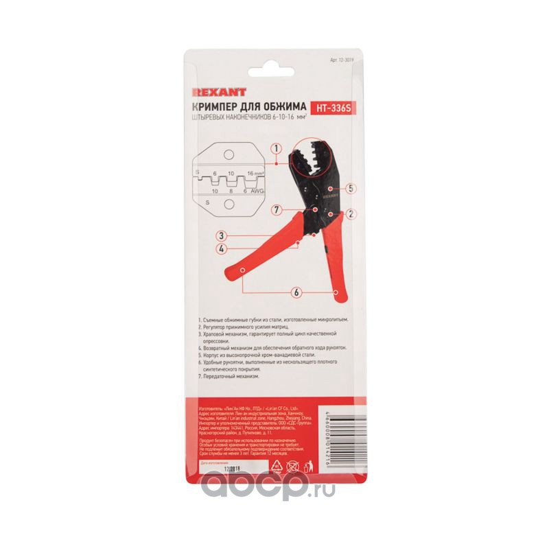 Кримпер REXANT HT-336 S для обжима штыревых наконечников 6.0-10.0-16.0 мм²